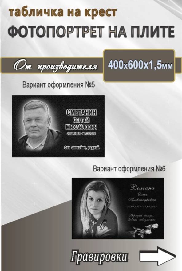 Изготавливаем памятные плиты на граните, керамограните и стекле. Готовые варианты оформлений с размерами и ценой представлены в нашем магазине. Нестандартные заказы расчитываем по вашему запросу.